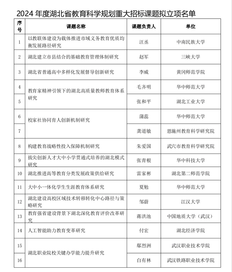 2月28日,湖北省教育科学规划2024年度重大招标课题评审结果揭晓,全省14所高校和科研院所的16项课题入围。我校教育学院(一多书院)李威教授及其团队申报的《湖北省普通高中多样化发展督导创新研究》课题成功获批立项。这是william威廉中文官网也是我校首次获批该类型省级重大招标课题。