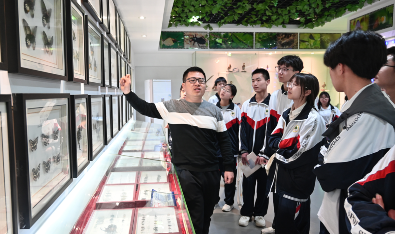 走进生物标本馆,学生们瞬间被琳琅满目的动植物标本吸引。丹顶鹤展翅的优雅姿态、大别山珍稀植物的精细剖面、远古化石的神秘纹路,配合VR技术还原的森林生态场景,让书本上的知识变得触手可及。“快看!这只蝴蝶的翅膀在显微镜下像星空一样!”一群学生围在互动实验台前,兴奋地操作数码显微镜。馆内还设置了“生态保护答题闯关”游戏,学生们通过扫描标本二维码获取知识,在趣味互动中思考生物多样性保护的意义。“原来科学可以这么好玩,我以后想学生态学!”一名高一学生激动地说。