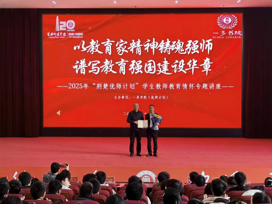 讲座步入尾声,校党委常委、副校长夏庆利为刘秀祥老师颁发黄冈师范学院客座教授聘书,对他带来的兼具深度与温度的分享致以诚挚谢意,感谢他用自身奋斗历程与育人初心,为优师计划学子注入坚定的理想信念与成长力量,让在场青年深刻领悟到教育的温度在于对每一个生命的珍视与关怀。