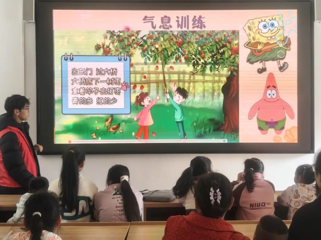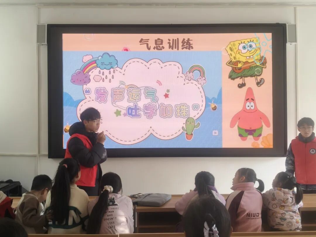 活动伊始,志愿者们通过系统的口部操和体态训练,为孩子们打下扎实的表达基础。“小蛤蟆鼓气”“小木鱼张嘴”等趣味口部操让孩子们在欢笑中活动唇舌,而绕口令训练《打枣歌》则帮助他们在韵律中掌握气息控制。与此同时,志愿者们悉心指导孩子们塑造小主播的专业仪态——“站姿小松树”让身姿挺拔,“微笑小太阳”让表情生动,“手势小指挥”让动作得体。发音与体态的同步训练,使孩子们在寓教于乐的互动中初具小主播风范。