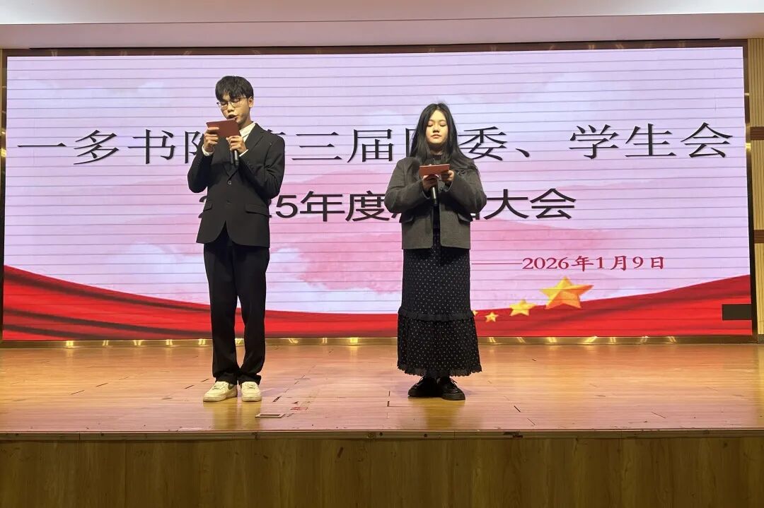 2026年1月9日晚,一多书院(优师计划)团委、学生会年终总结大会在北区一站式学生社区大学生活动中心正式召开。本次大会以“书院深耕优师志,团学实干践初心”为主题,系统回顾学年工作,表彰先进典型,并对未来发展作出展望。书院团委书记胡涵伊、辅导员曹钰涓,以及团委、学生会全体成员、主持队队员共同参会。会议由主持队张砚溪、李明悦同学主持。